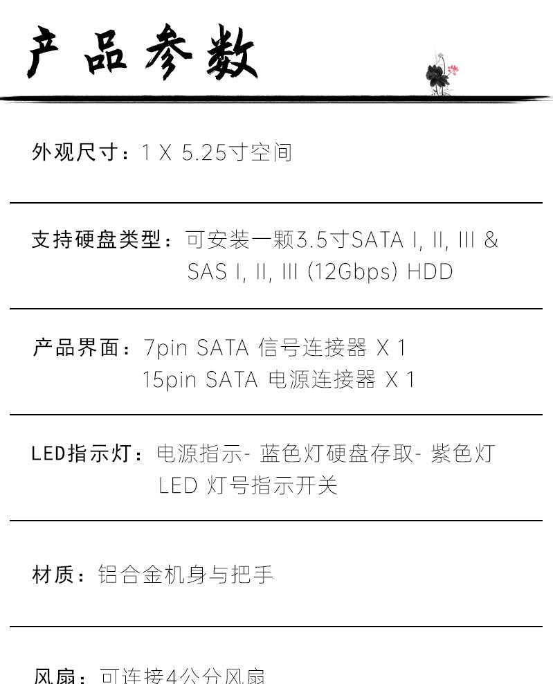 | 数据传输速率 | 支持SATA I, II, III & SAS I, II, III(12Gbps) |