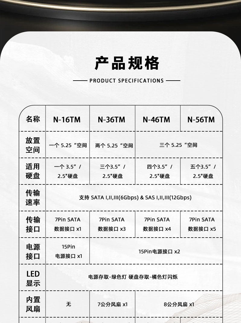| 适用硬盘尺寸 | 可安装五颗3.5"或2.5"硬盘 |