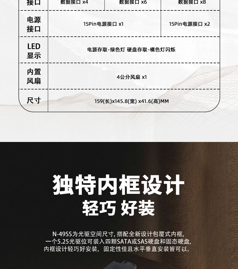 | 放置空间 | 用一个5.25“光驱位,容纳四个硬盘 |