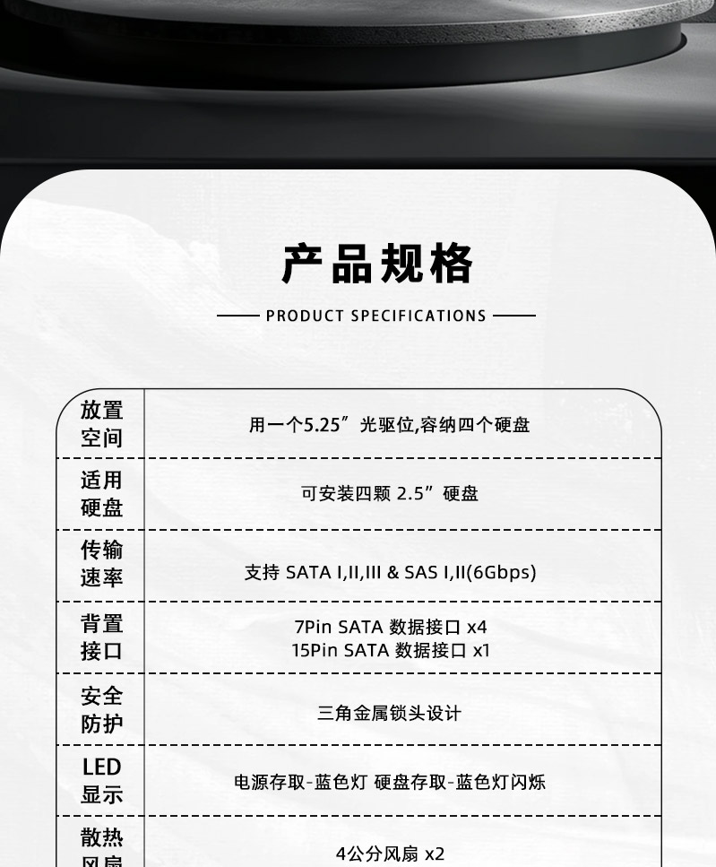 | 适用硬盘尺寸 | 可安装四颗 2.5"硬盘 |