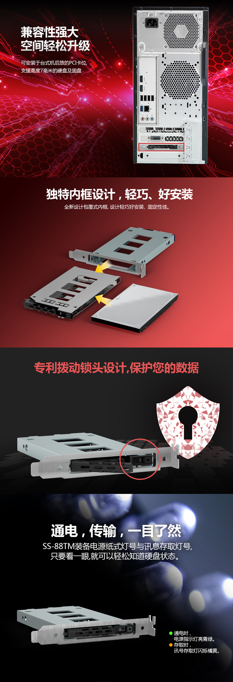| 放置空间 | 用一个PCI卡位,容纳一个硬盘 |